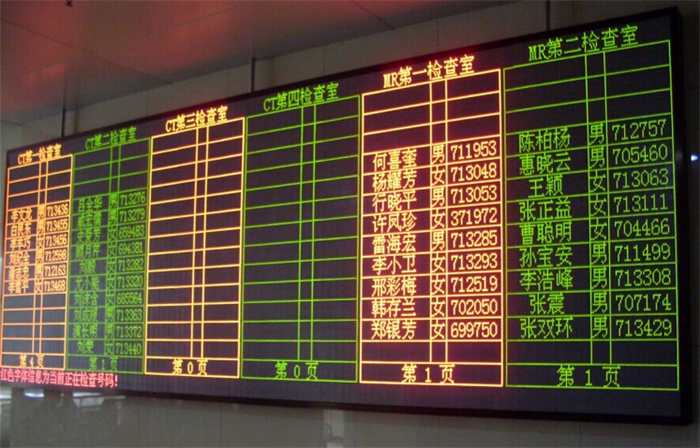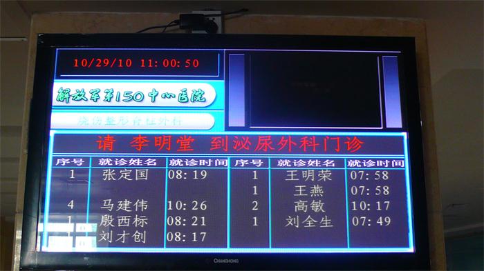分診區綜合顯示屏,顯示等候患者與正在呼叫的患者信息, 綜合顯示屏可用液晶電視加機頂盒方式,也可用LED顯示屏顯示